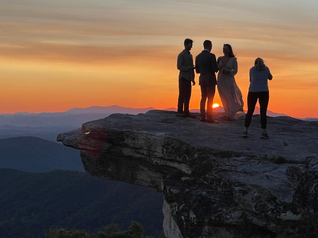 Part of me, however, hoped to see the bear again. It would be quite a photo opportunity if the bear were out on the rocks, silhouetted against the colors of a rising sun. The sky began to brighten just as I reached the top. Hearing a commotion out on the ledges, I thought I might get my wish. But this time, the surprise wasn’t a bear, but a sunrise wedding!